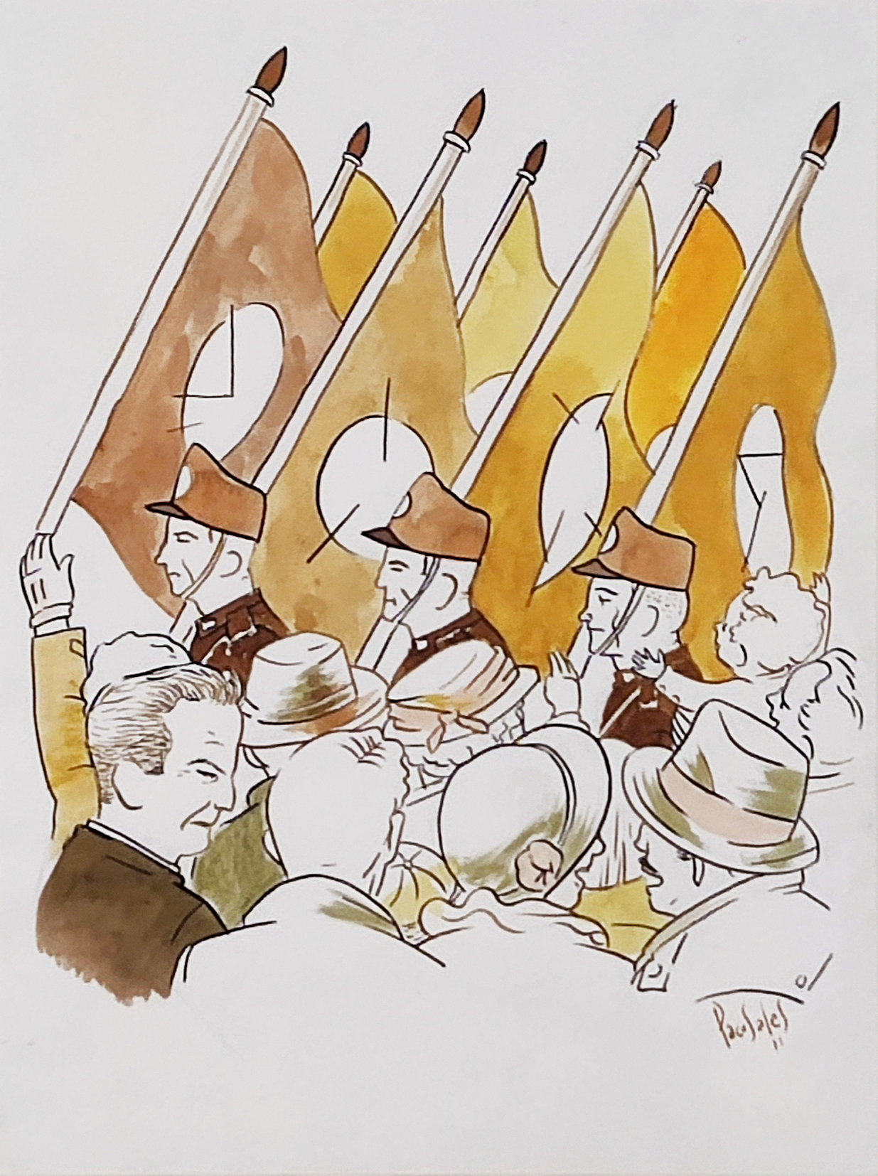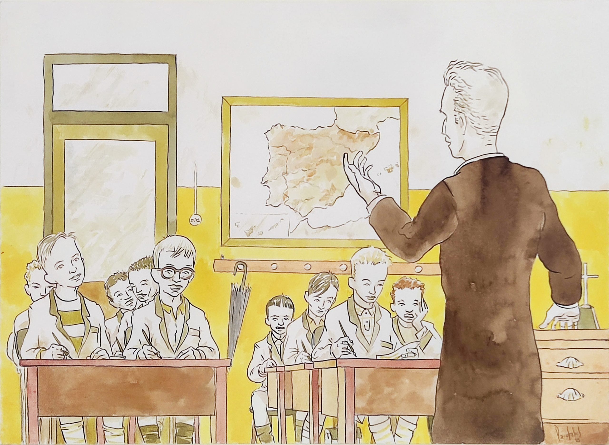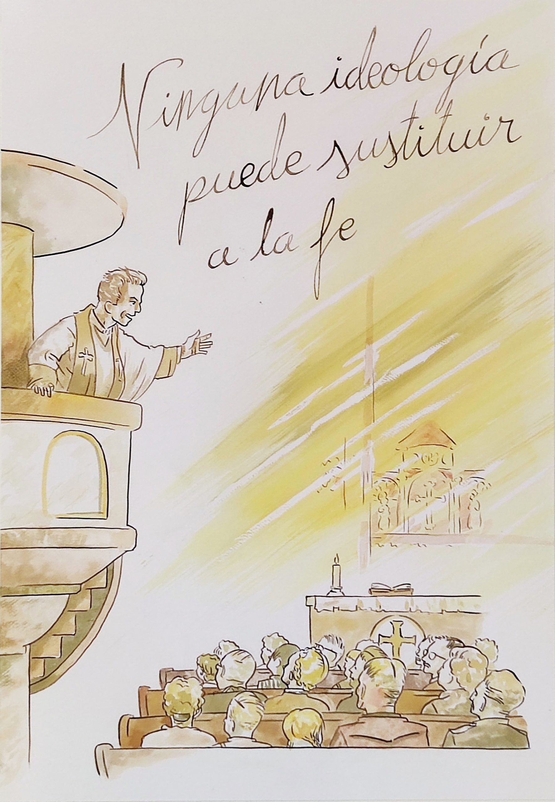 4 de las 14 láminas con ilustraciones para el comic de Santiago Gapp «No callaré» realizado por el ilustrador Pacosales expuestas en el colegio del Pilar de Valencia en la sala Gapp.